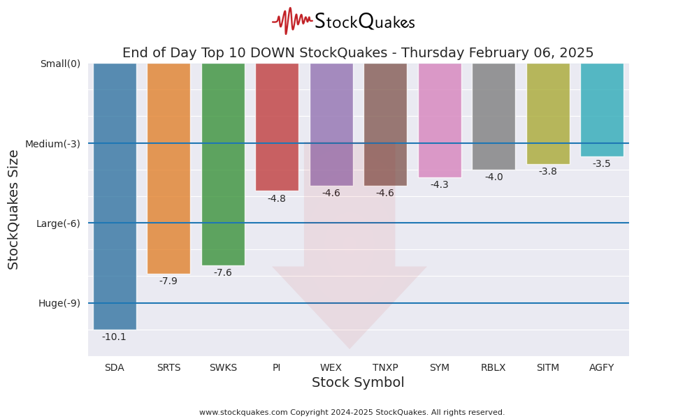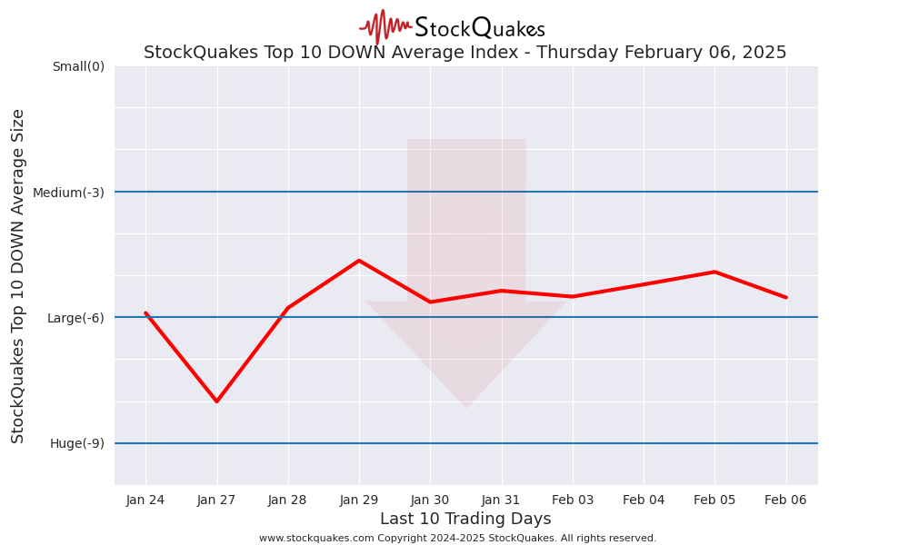 Showing the daily top 10 DOWN stock symbols and their StockQuakes values.