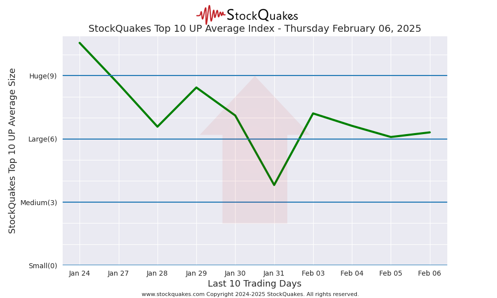 Showing the daily top 10 UP stock symbols and their StockQuakes values.