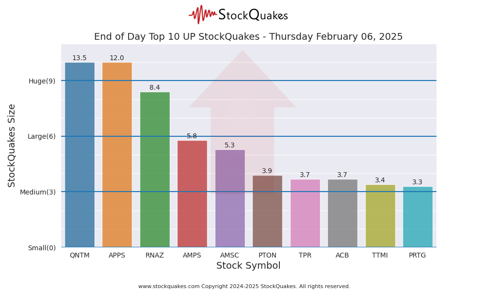 StockQuakes are measures of the amount of change in multidimensional stock data. The bigger and more noteworthy the amount of change, the bigger the StockQuakes number and size. StockQuakes sizes are small, medium, large, and huge. StockQuakes uses proprietary AI algorithms to calculate StockQuakes levels on over 5000 stocks after each daily stock market close. StockQuakes are either UP or DOWN, depending on the slope of the stock price from daily open price to daily close price.